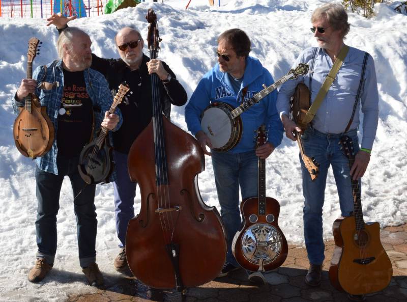 Mais si vous avez déjà croisé et entendu certains d’entre eux, par exemple Ross et Mox, rejoints par Alain Kempf (contrebasse) jouant à la terrasse d’un café pendant La Roche Bluegrass Festival, vous savez déjà que dynamique, humour et beaux instruments composent une set-liste carrément variée et qui balance joyeusement. Ajoutons à ça que ces gars-là aiment visiblement chanter et vous avez déjà un bon aperçu du son du groupe.