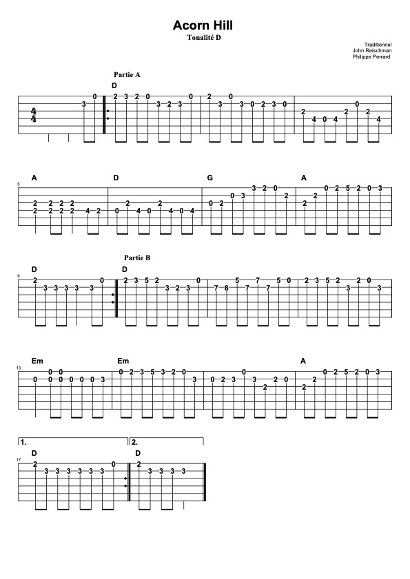 Lors d'une jam, j'ai appris un fiddle tune bien sympa "Acorn Hill Breakdown". Vous pouvez écouter ma version guitare flatpicking sur https://www.youtube.com/watch?v=q4pZfFsYbOw.