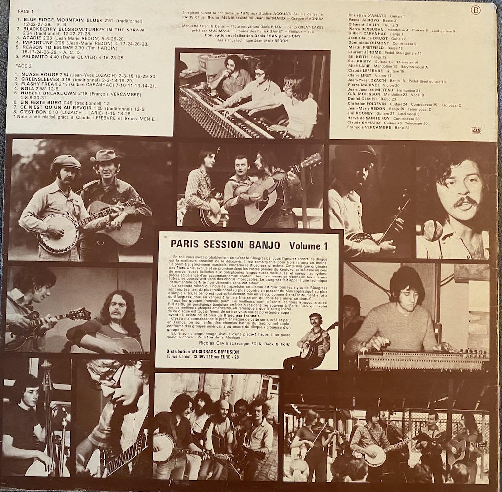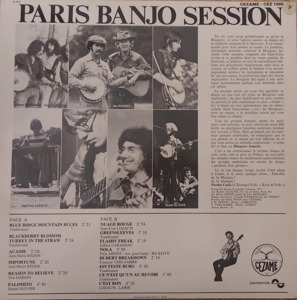 Dans les années foisonnantes des seventies, avec des concerts et festivals, des revues musicales, et des magasins d’instruments qui répondaient à une demande grandissante, les initiatives se sont multipliées. C’est de Denis Phan, qui tenait boutique à Paris avec « Musimage », qu’est venu un autre disque culte du Bluegrass français : « Banjo Paris Sessions ». Son pari fou fut de faire enregistrer par des musiciens français un disque autour du banjo, chaque banjoïste étant accompagné par son groupe ou par un line-up d’instrumentistes de talent. La cerise sur le gâteau, la France étant parfois visitée par des musiciens américains, fut la participation de Bill Keith, banjoïste emblématique de la scène américaine, lequel amena avec lui son comparse guitariste Jim Rooney.