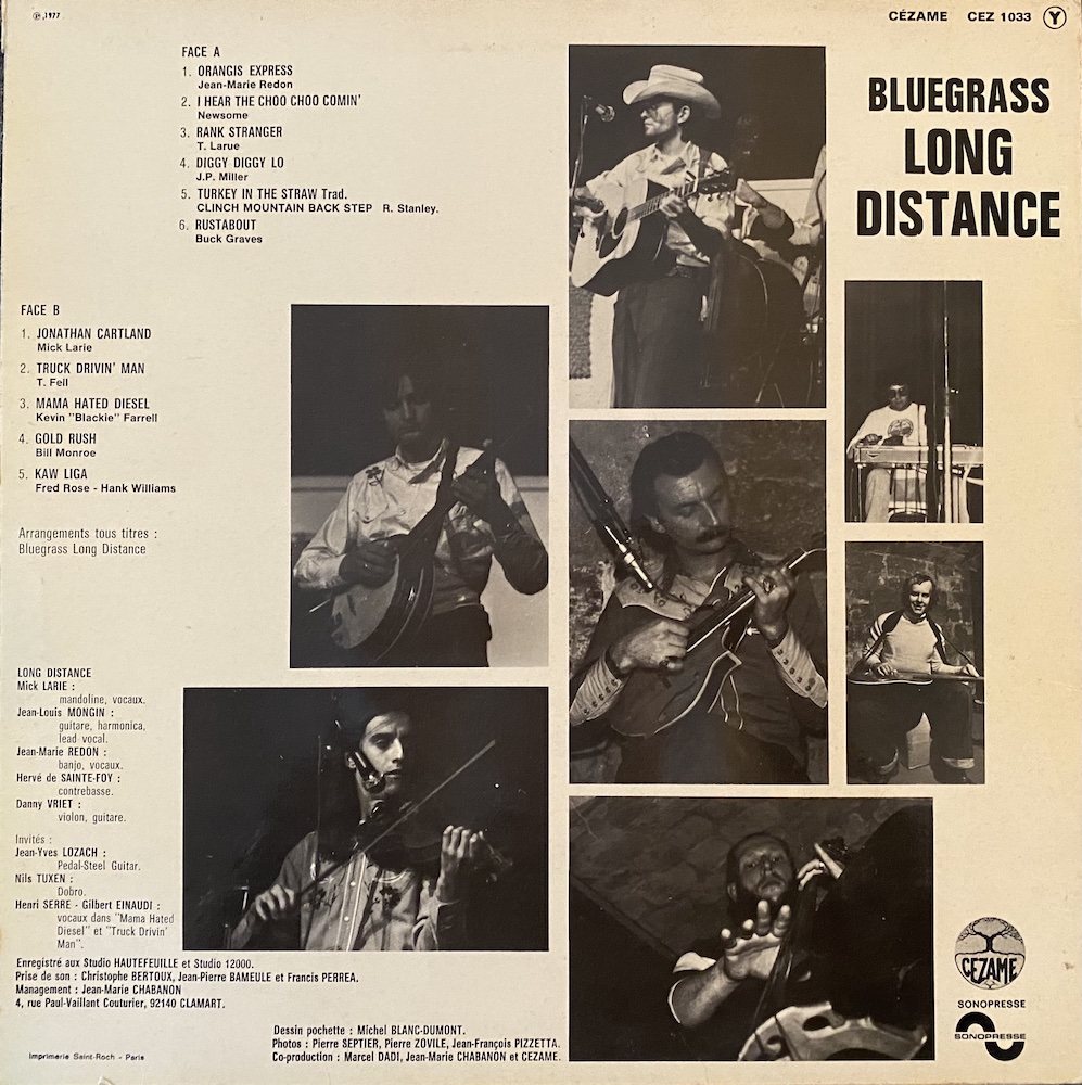 C’est en 1977 que l’autre moitié de Bluegrass Connection signera son retour discographique, Bluegrass Long Distance devenant simplement Long Distance. Piliers du groupe, Mick Larie, Jean-Marie Redon et Hervé de Sainte-Foy, qui ne sont pas restés inactifs tout ce temps, accompagnant notamment Marcel Dadi et tournant aux USA, présentent avec leur disque la nouvelle formation du groupe qui comprend désormais Jean-Louis Mongin, guitariste chanteur que l’on avait vu dans des groupes Country et Country Rock (Herbe Rouge), Dany Vriet au violon, qui jouait auparavant avec le groupe de Poitiers Bluegrass Metrognome, et le bassiste/contrebassiste Henri Serre. Henri fit partie à la fin des années 60 et dans les années 70 de divers groupes de Pop française.