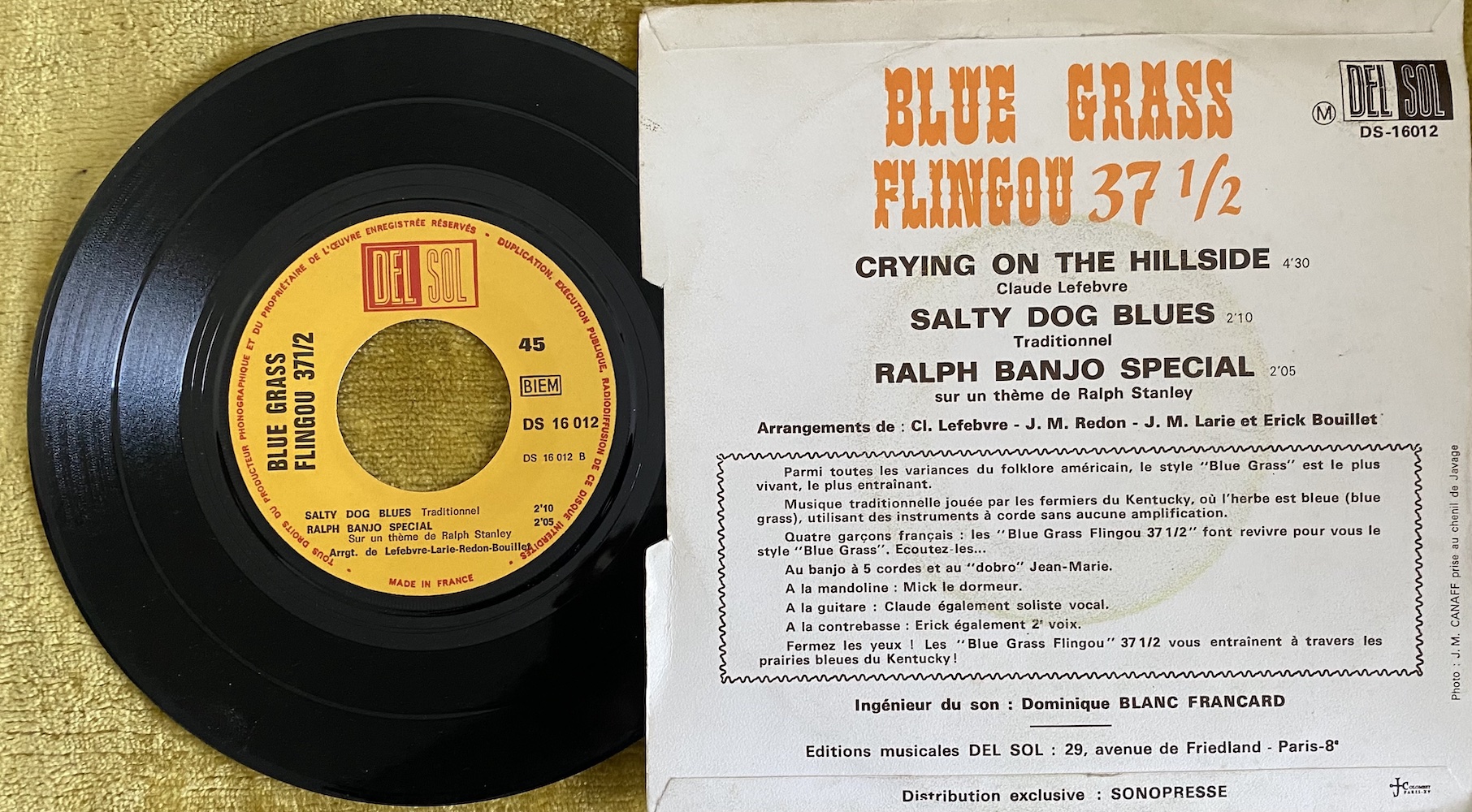 C’est effectivement un EP, mais avec 3 titres seulement, qu’a sorti en 1969 Bluegrass Flingou 37 ½ et qui est sans doute le tout premier vinyle existant du Bluegrass français. Petite anecdote personnelle, j’avais alors à peine 14 ans et je me souviens très bien avoir lu dans Salut Les Copains (oui !!!!), un petit article présentant cet EP. J’ignorais totalement ce que pouvait être le Bluegrass, moi qui n’avais d’oreilles que pour la Pop et le Rock !