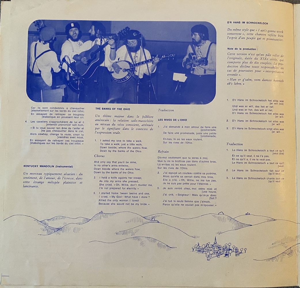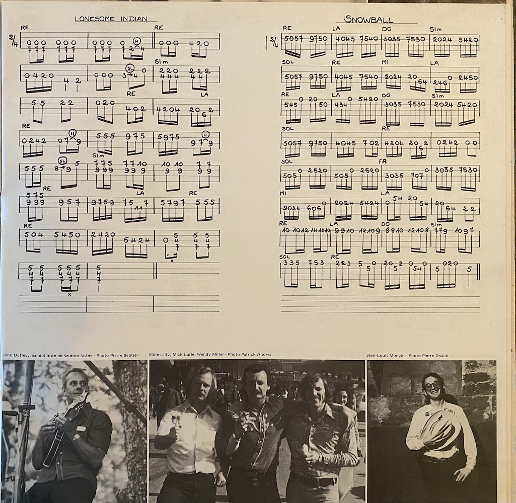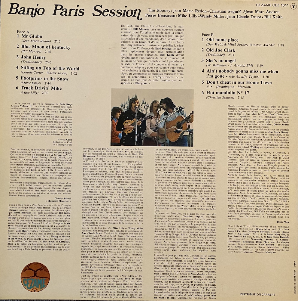 Les noms des musiciens ne figurent pas sur la pochette, mais aidé par mes souvenirs et quelques recherches sur le net, j’ai pu identifier Jean-Paul Puccio au banjo, Jean-Paul Raffin à la guitare, Chris Elsass au dobro et Lionel Wendling à la contrebasse, liste sans doute non complète. Toute info complémentaire est la bienvenue !