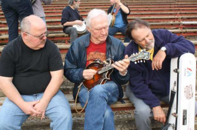 Les trois musiciens ont choisi de jouer assis. Jim Hurst assure une impeccable rythmique, comblant au mieux l'absence de contrebasse. Au centre l'infatigable Byron Berline alterne mando et violon, souvent au sein du même morceau. Une énergie et une aisance impressionnantes l’animent. Alan Munde développe des back-up et solos tout en finesse. J'ai souvenir en particulier d'un magnifique arrangement sur Wayfairing Stranger. En guise de dessert, le trio joue quelques morceaux proposés par le public, dont le délicieux Peaches and Cream. La soirée s'achève par Big Spike Hammer et Shenandoah breakdown, toutes troupes confondues.*