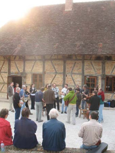 mains je me décidais d’appeler La Grange Rouge,il ne restait que deux places libres dans la classe de banjo. Je me jetais alors à l’eau en nous inscrivant, Bernard et moi. Partis de Lille puis Valenciennes en fin de matinée, nous arrivâmes sur place à La Chapelle Naude (77) le Vendredi soir, en bénéficiant d’un chaleureux accueil de la part des bénévoles de l’association La Grange Rouge qui nous mirent très vite à l’aise (encore merci à eux qui font un travail formidable). Bernard ayant pris le lit du haut, moi en dessous, nous passâmes une nuit un peu agitée par les ronflements teutons du troisième pensionnaire du petit dortoir mis à notre disposition.