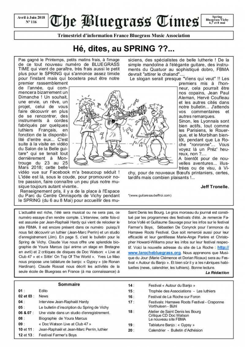 Avril - mai - juin 2018 Ce numéro du Bluegrass Times est ici en libre consultation et téléchargement. Parcourez-le et, si vous appréciez sa qualité éditoriale, adhérez à France Bluegrass Musique Association, vous recevrez gratuitement l'édition numérique quatre fois par an.